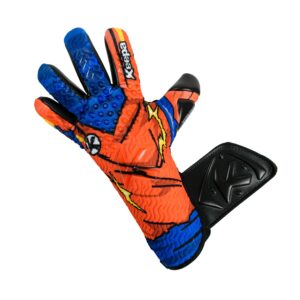 Dorso: neopreno transpirable con injertos de silicona que ayudan al armado del guante y darle más cuerpo a la zona. Palma látex vita grip con alto agarre y durabilidad moderada de un espesor de 3.5 mm de látex y 3.5 mm de esponja para la amortiguación de impactos del Balón. Broche: media vuelta de látex para darle una palma extendida y así darle visibilidad al área del dorso. Corte: roll negativo que ayuda a tener más contacto el látex con balón sin desproteger la palma y dedos